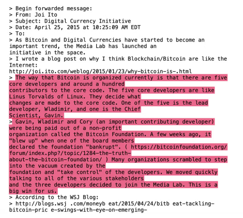 This is Ito directly telling Epstein that his money let MIT “move quickly and win this round” by funding the devs who pushed the small-block path. Epstein’s casual reply about Gavin Andresen (Bitcoin’s lead developer at the time) shows he was paying attention.
