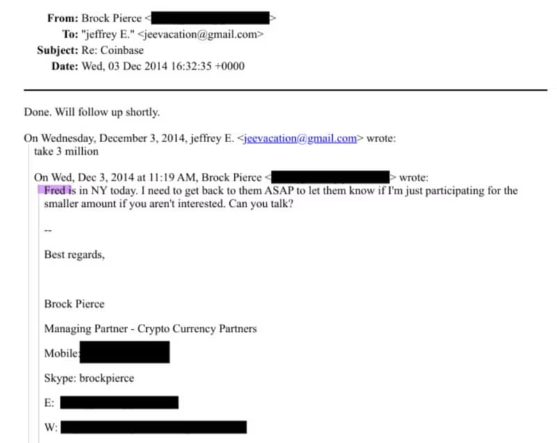 He personally brokered Epstein’s $3 million investment in Coinbase in late 2014. He arranged meetings, forwarded investor updates to Epstein, and pitched crypto deals directly to him.