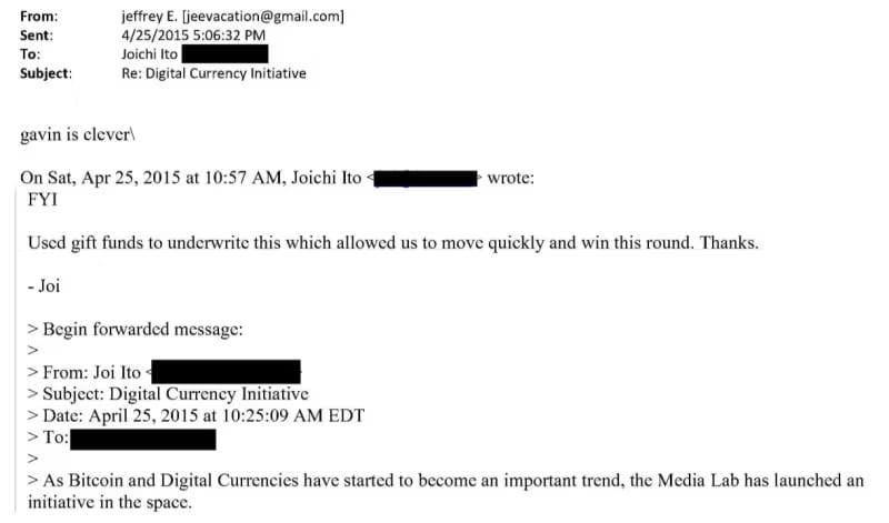 But look at this actual email from the Epstein files, dated April 25, 2015. Epstein writes to Ito: “gavin is clever.” Ito had just thanked him for the “gift funds” that underwrote the Digital Currency Initiative launch: