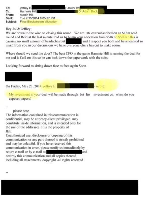 Epstein also put $500,000 into Blockstream, a company that built tools to keep Bitcoin on the small-block path and promoted Lightning Network. That investment came through a fund co-owned by Joi Ito.